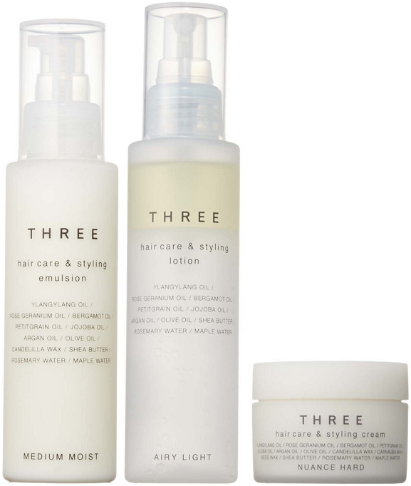 THREE「ヘアケア&スタイリング エマルジョン」は、「美的」「MAQUIA」ヘアケア部門4位を受賞している他、「MORE」ヘアケア部門賞でのまとまり、「non-no」最愛スキンケア・ヘアケア・フレグランスBEST3 でのアウトバスヘアコスメ部門3位に選ばれています。