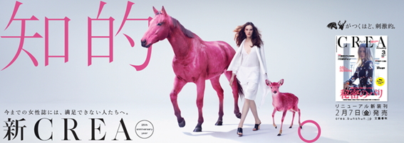 知的だからこその、余裕と遊び心を持つ女性読者像を掲げてのリスタートとなる新生「CREA」でまず驚かされたのは、赤い馬と鹿と女性による“知的馬鹿”という、思いもよらない斬新な組み合わせの広告ビジュアル。…感性に訴える知的刺激を表現したビジュアル…としての掲載とのことでしたが、間違いなく目を惹く広告ではありました。東京、大阪の主要駅での大型ポスター、東急東横線女性専用車両中吊りジャック、メトロ銀座線・メトロ丸の内線・大阪地下鉄中吊りの他、日本経済新聞、朝日新聞等の新聞広告、Google・Yahoo! JAPANでのバナー広告等で幅広く公開されていましたので、きっとどこかでみかけられたのではないでしょうか?