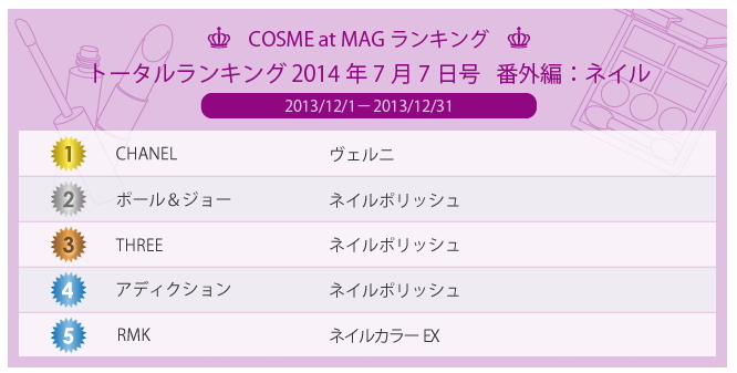 “トータルランキング2014年7月7日号 番外編:ネイル”の調査媒体は…2014年5月1日から31日までに発売された調査媒体78誌延べ93冊。さらにそのデータから、ネイルアイテムのみを抽出したものが今ランキングとなっています。詳しい調査媒体はこちらを参照してください。