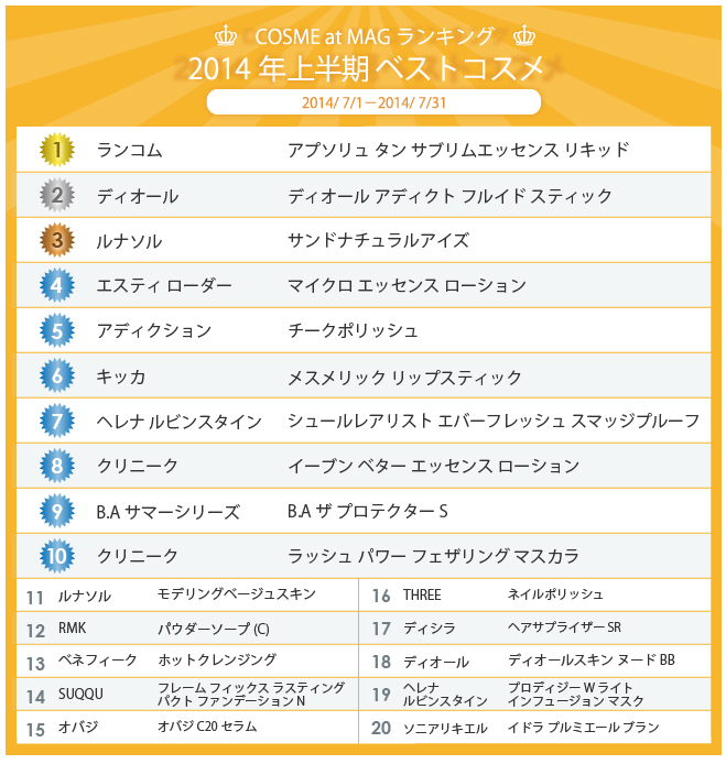 COSME at MAG 7月集計・2014上半期ベスコスランキングの調査媒体は…2014年7月1日から31日までに発売された調査媒体79誌延べ98冊。詳しい調査媒体はこちらを参照してください。