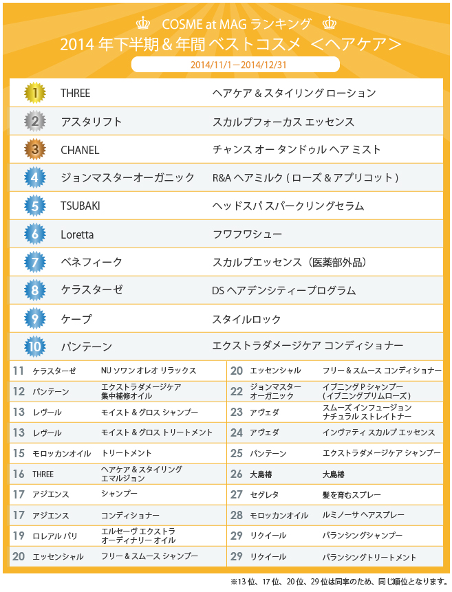 ここでは2014年11月から始まった2014年ベストコスメ発表の中からヘア関連のアイテムをまとめた2014年 下半期&年間のベストコスメランキング ヘアケア編を発表します。