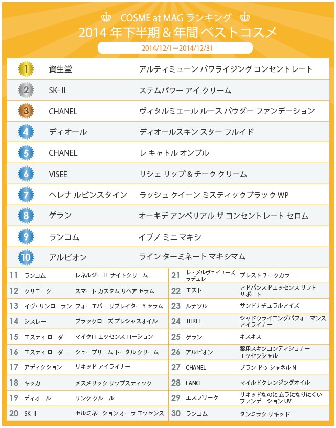 前期に「MAQUIA」で2014年下半期ベスト・オブ・ベスト大賞を受賞し話題となったSK-II「ステムパワー アイ クリーム」が継続2位。今期も「VoCE」アイケア年間1位、「BAILA」スキンケア大賞、「美的」読者投票による信頼のスキンケアコスメのアイケア1位、「25ans」ビューティ・メダリスト大賞 の銀メダル、「Marisol」アイケア たるみ BEST 1、「MORE」お悩み別スキンケア 目もと1位、「steady.」アイクリーム1位、「CREA」アイケア1位等、多くのアイケアの頂点を獲得しています。