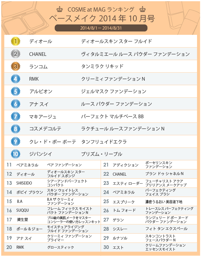 <COSME at MAGベースメイクランキング 2014年10月号>の調査媒体は…2014年8月1日から31日までに発売された調査媒体77誌延べ90冊。詳しい調査媒体はこちらを参照してください。