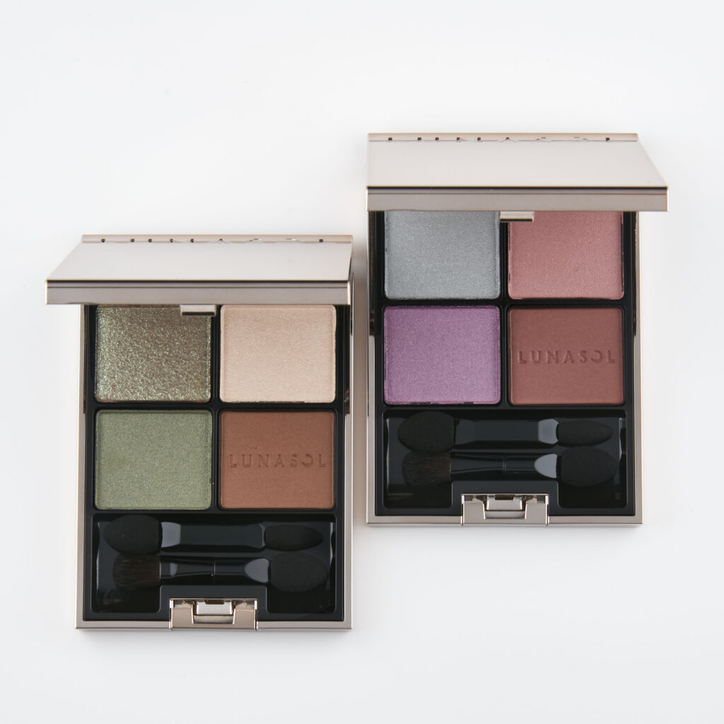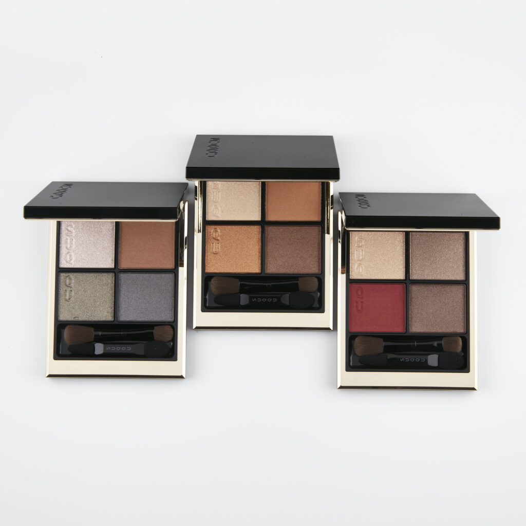 4色からなるパレットは、立体感を演出する質感の異なるメインカラー2色(パレット右上、左下)、メイクの仕上げにきらめきをプラスするコートカラー(パレット左上)、そして黒すぎない色味にこだわり、メイク全体の印象を柔らかく引きしめるディープカラー(パレット右下)の構成。贅沢に配合されたクリアパールが透き通るような抜け感を演出し、乱反射するパールがより生き生きとした光沢を叶えます。粉っぽさもなく色ムラになりにくいため、どう重ねても、大人の女性の新たなベーシックを美しく引き出せると各誌でも評判です。
