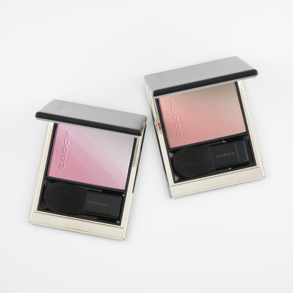 カラーにより“チーク×ハイライト”と“ダブルチーク”の2タイプで登場し、艶を大切にするSUQQUならではの微細なパールをふんだんに使用した艶感処方により、チークカラーでは面で光るパールで上品な艶感を、ハイライトカラーでは点で光る細かいパールで華やかな艶感をそれぞれプラス。さらにパールの粒子が微細なまま肌にのることで、ほど良く境界線がぼけ、より自然な艶を叶えます。