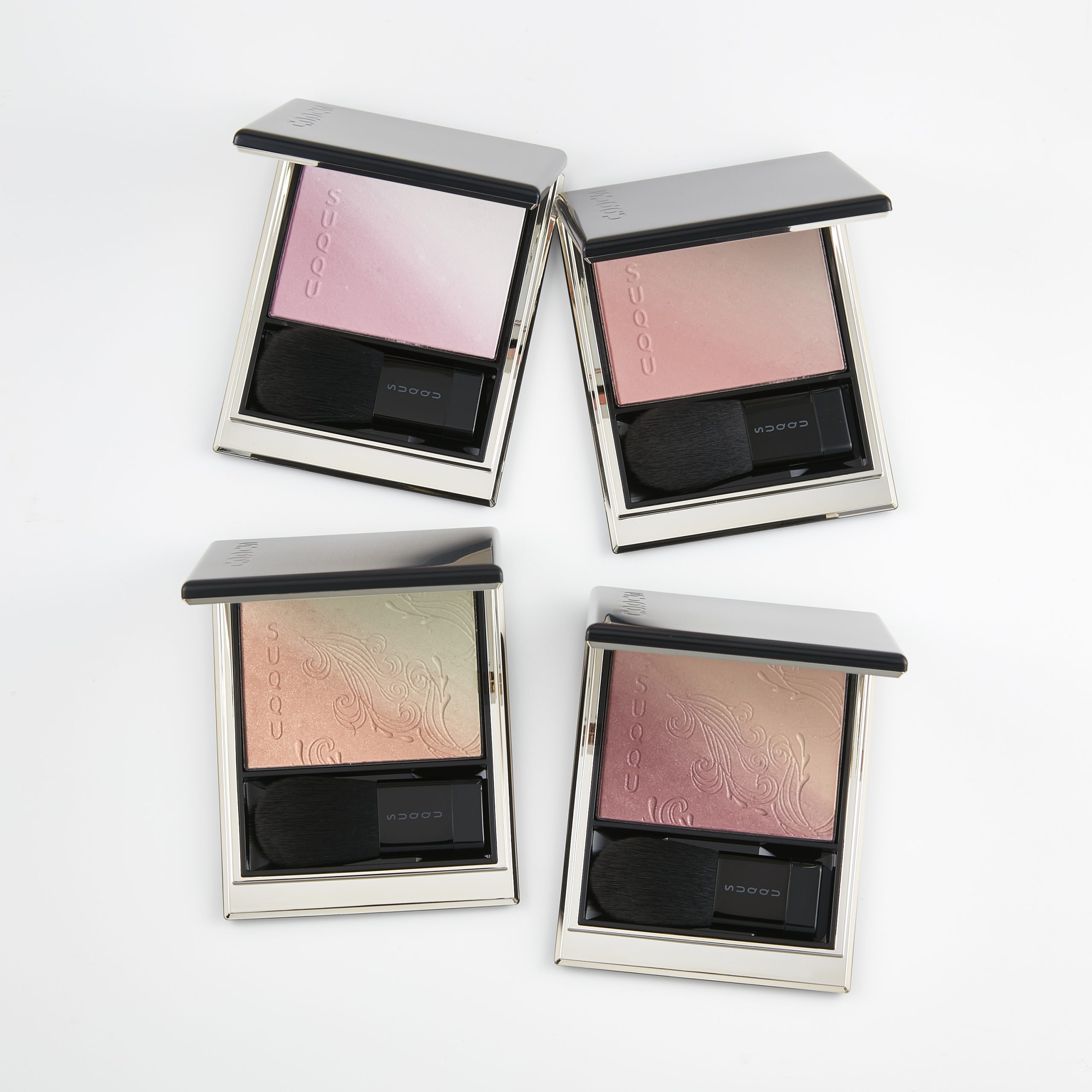 カラーにより“チーク×ハイライト”と“ダブルチーク”の2タイプで登場し、艶を大切にするSUQQUならではの微細なパールをふんだんに使用した艶感処方により、チークカラーでは面で光るパールで上品な艶感を、ハイライトカラーでは点で光る細かいパールで華やかな艶感をそれぞれプラス。さらにパールの粒子が微細なまま肌にのることで、ほど良く境界線がぼけ、より自然な艶を叶えます。