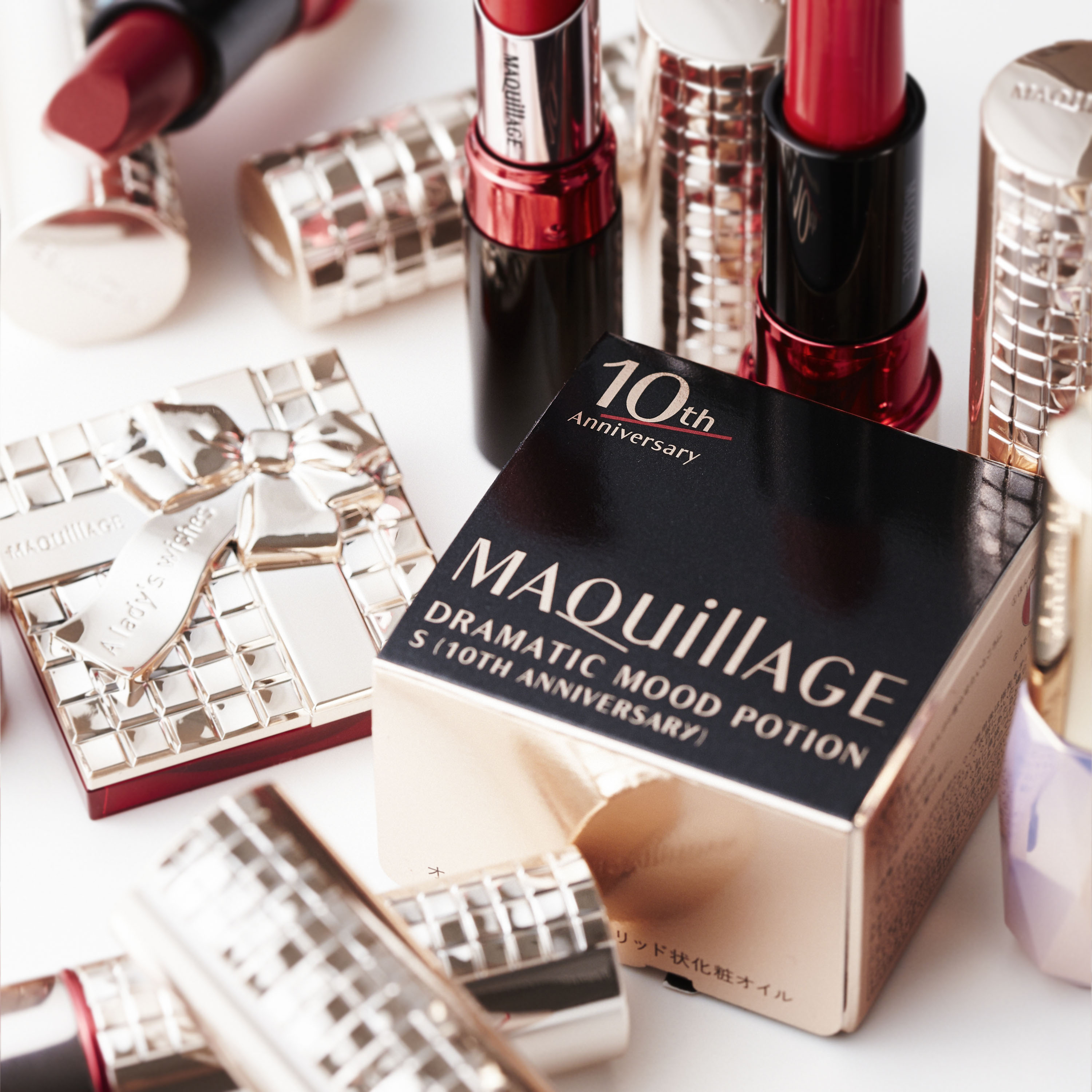 セットされているのは、「ドラマティックハイヒールコンパクト」のためのマルチに楽しめる5色5質感の「ドラマティックムードヴェール(10TH アニバーサリー)」に、10周年限定カラーの“レディレッド”の「ドラマティックルージュ」、「ドラマティックムードポ―ション S(10TH アニバーサリー)」。