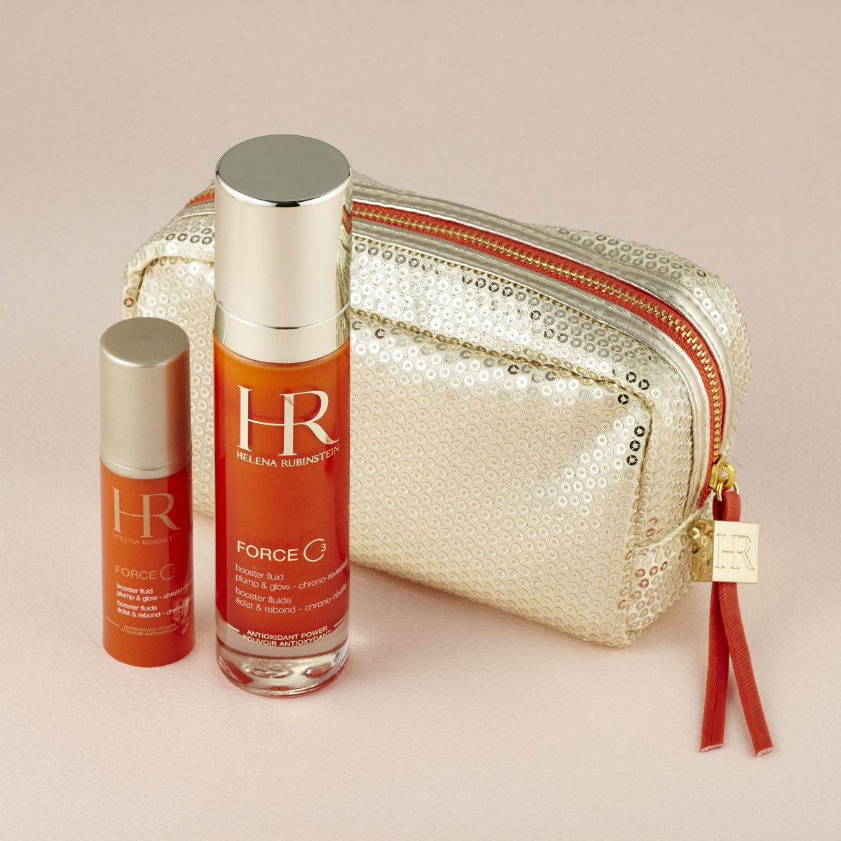 ゴールドのスパンコール地に「フォース C. 3」とお揃いのビビッドなオレンジラインが施された華やかなポーチは、気分をもアップさせてくれます。