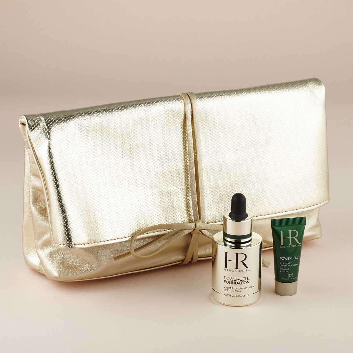 **ヘレナ ルビンスタインからは、パーティバックとしても使用できるクラッチタイプのゴールドのポーチがセットとなった「クリスマス ファンデーション キット」も同時に発売されます。