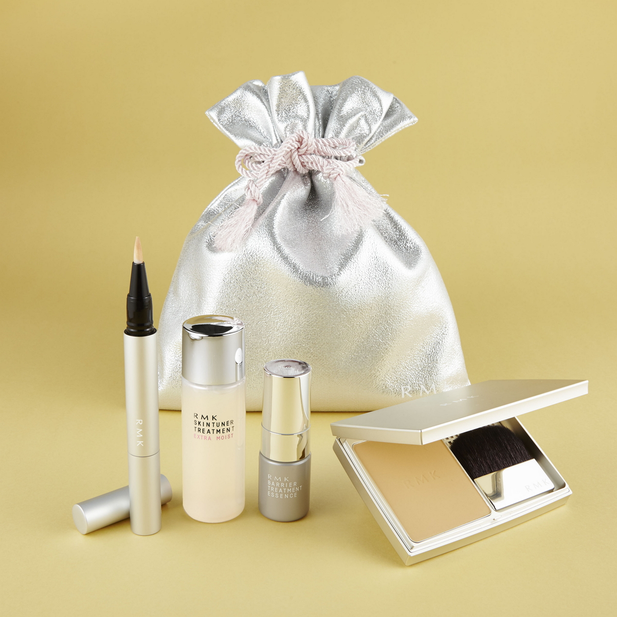 ミクロレベルの超微粒子固形オイルとパウダーをブレンドすることでパウダーなのにエアリー感のある仕上がりが話題の秋冬の新作「RMK エアリーパウダーファンデーション」と人気の「RMK クリーミィファンデーション N」(共に現品)をセレクトすることができ、パールリッチな仕上がりでジュエリー感のある肌を演出する限定色の「RMK スーパーベーシック リクイドコンシーラー N (P)」がセットに。