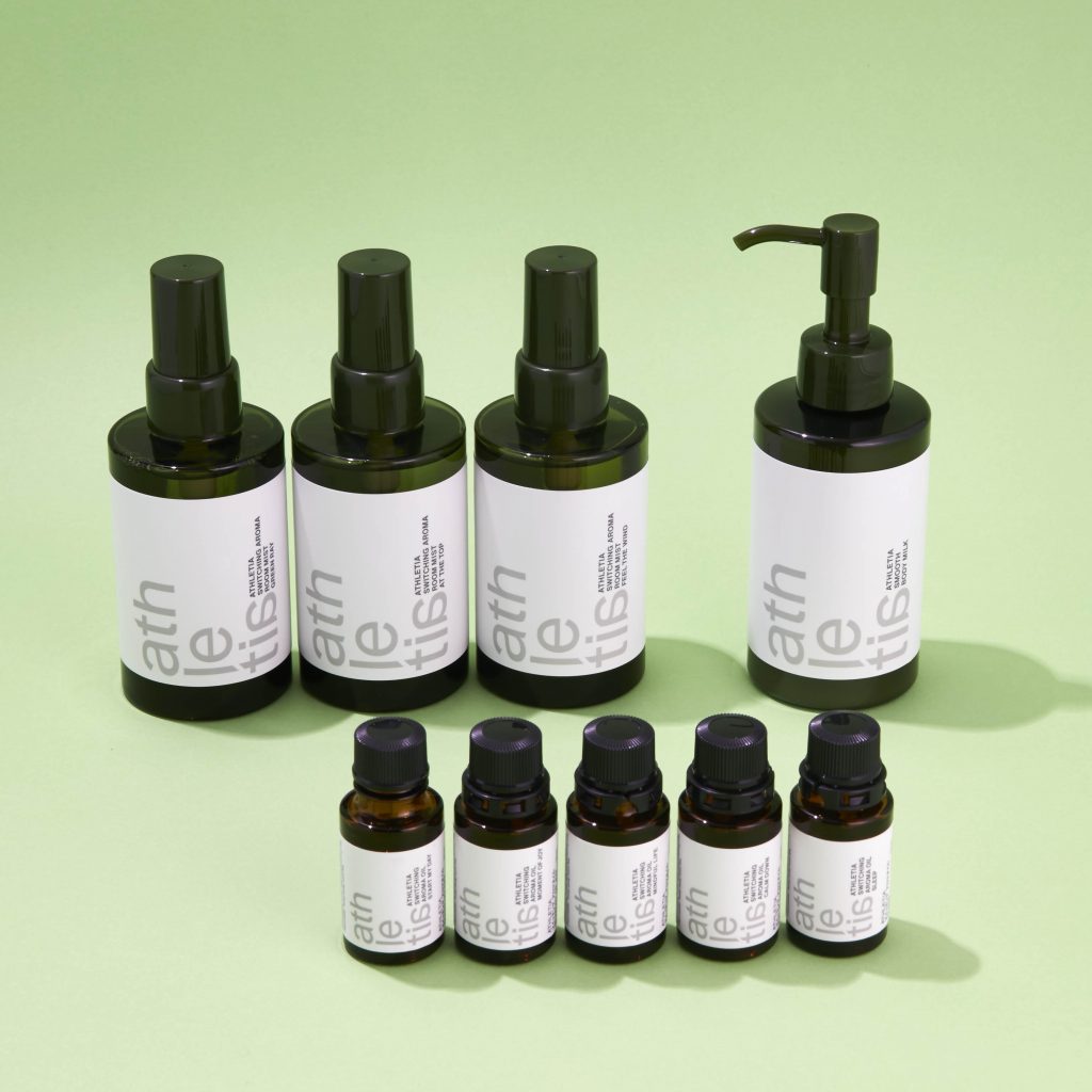 アクティブライフに寄り添うアスレティアの“静”の部分を担うのがbreathe & sleep 。呼吸と睡眠の質に着目し、提案するのは集中力を高め、頭をクリアにすることで、自らの心や体の声を聴き、コンディションを整えるアイテムとして登場するのは、天然の植物精油を独自のブレンドで配合した「スイッチング アロマルームミスト」3種と、「スイッチングアロマオイル」5種、さらに4月に加わったボディミルクの3アイテムでのラインナップ。香りで自らのコンディションを整えるのは、呼吸によるオンとオフ。