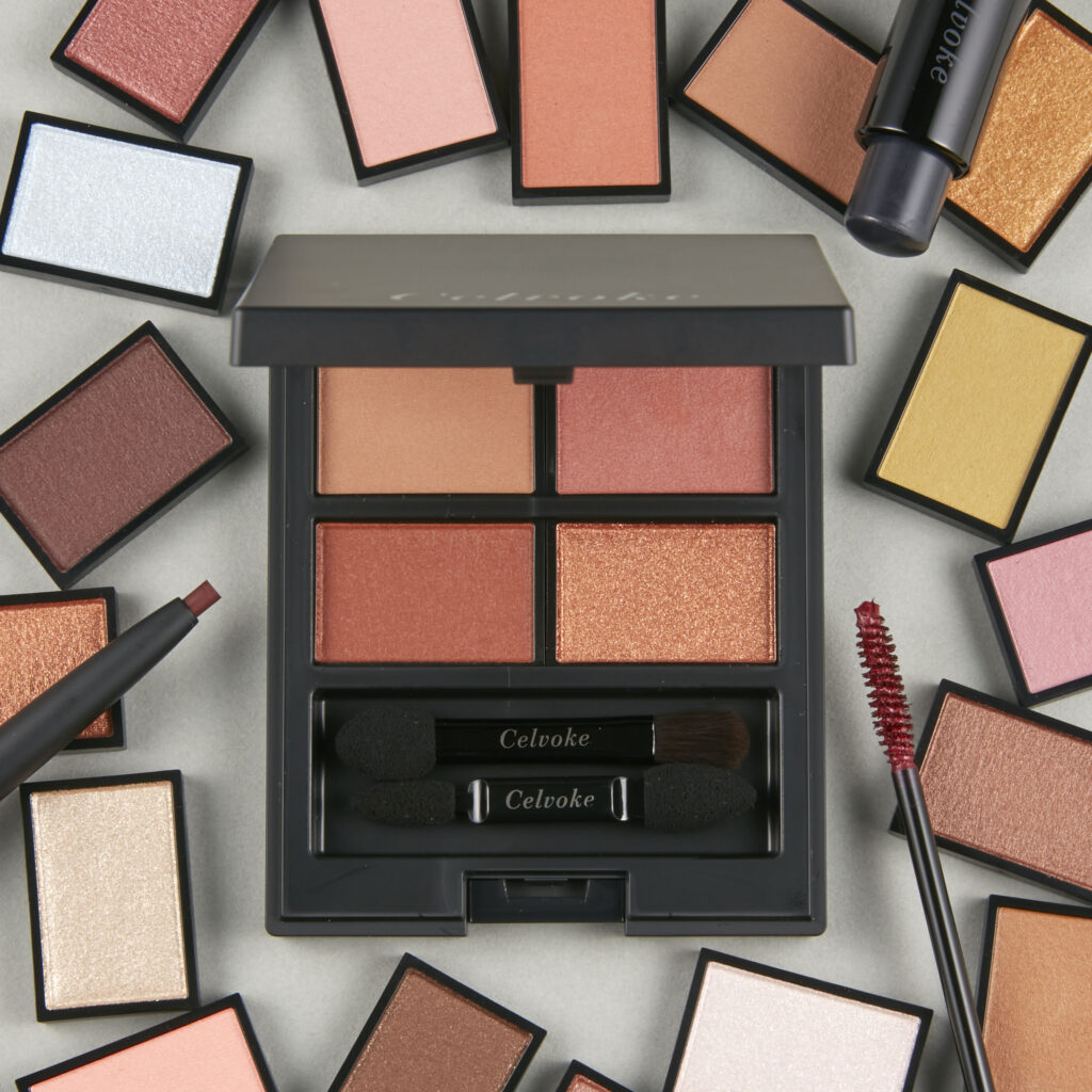 デビューラインナップは、誰でもテクニックなしにCelvokeならではの洗練モードを叶えることができるよう、こだわり抜き、計算し尽くされた色と質感の4色を組み合わせた5種のパレット。単色で抜け感を、色を重ねて奥行きを演出することができ、ノールールで自分らしく自由に楽しめます。アルガンオイル(オーガニック認証)、ローズヒップオイル、ローズマリー葉エキス配合。