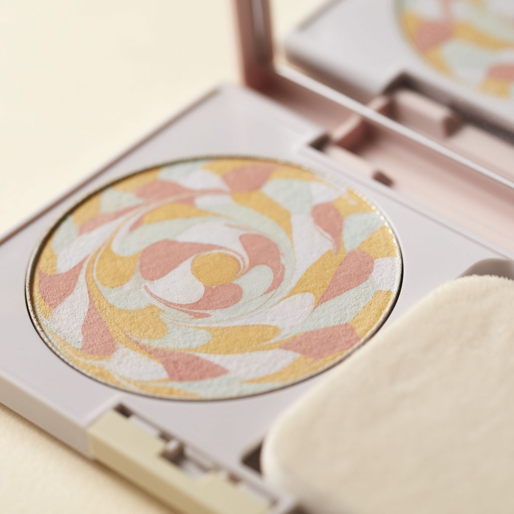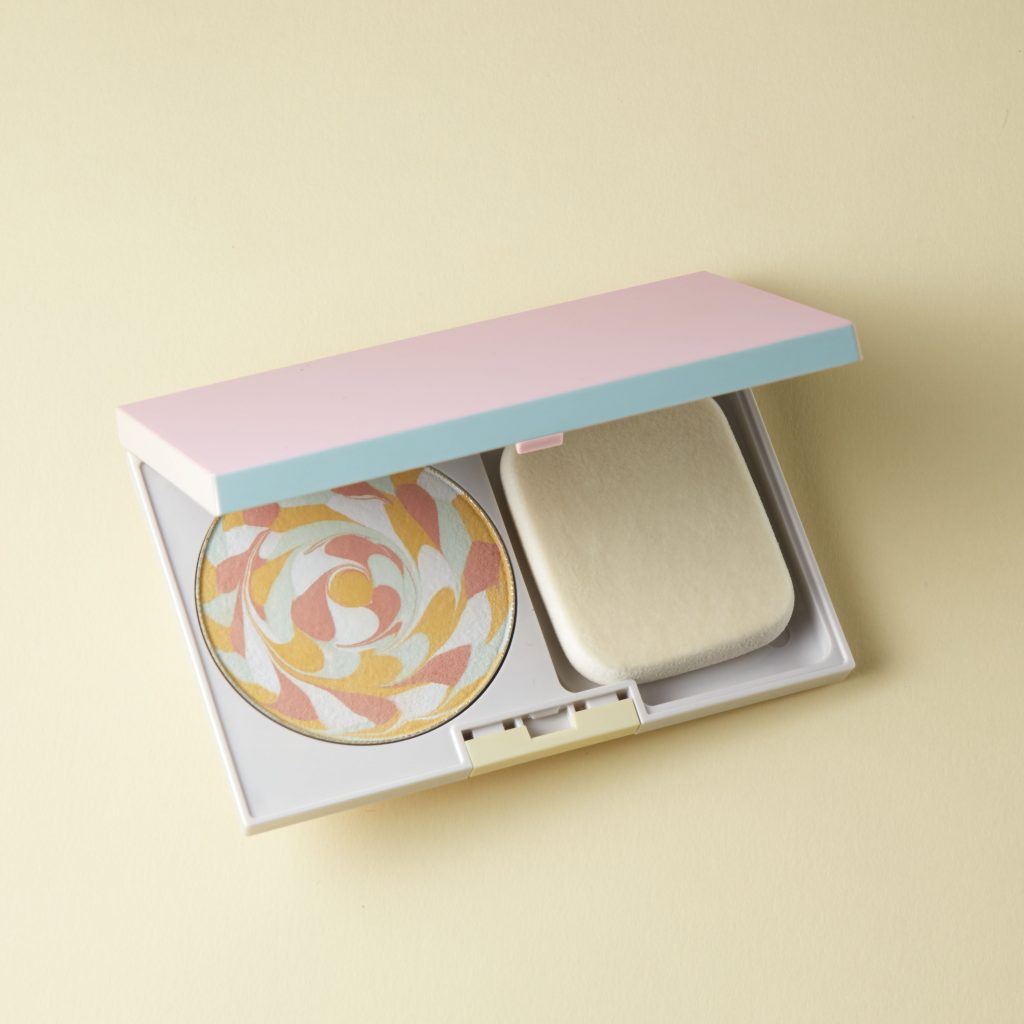使用方法は簡単。パクトの上から下に滑らせ、パフに付着したきれいな虹色のパウダーを、付属のパフのスポンジ面の1/3につけ、頬等の広い部分から外側に軽く伸ばし、頬の虹色が肌色になったら、キレイに塗布されたOKサインです。ツヤをプラスしたい部分にパフの裏側の起毛部分で円を描くように磨けば完成。難しいテクニックなしに、透明感や抜け感を手に入れることができます。仕上がりのカラーバリエーションは4色。自分の素肌に溶け込むようになじむ色をみつけてください。