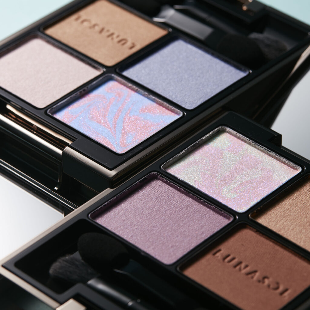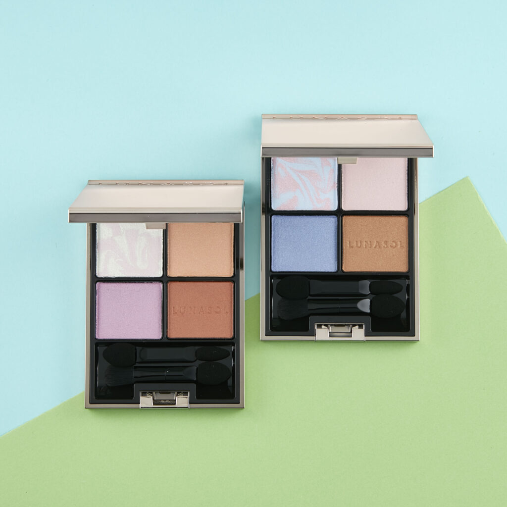 ■ルナソルを代表する4色アイシャドウパレット「アイカラーレーション」からは、初のマーブル模様のフローティングカラー(パレット左上)を取り入れ、春の光を感じさせる限定2種が登場。