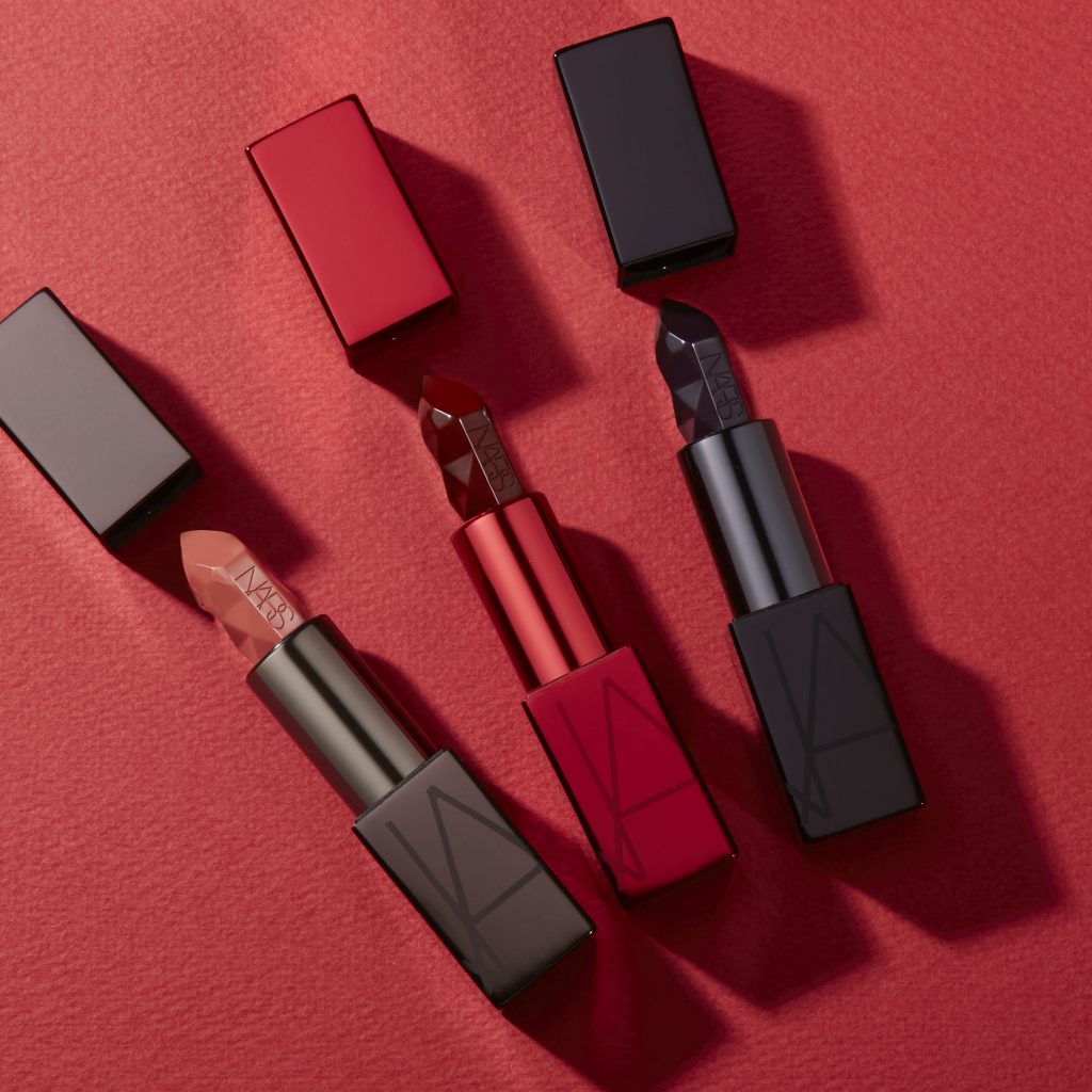 NARSの“HOLIDAY 2018 COLLECTION”を代表するアイテムとして注目されるのは、NARSのアイコニックリップ「オーデイシャスリップスティック」に、パンクファッションからインスパイアされた、スタッズシルエットとロゴを反映させたインパクトのあるデザインの「スパイクド オーデイシャスリップスティック」。今季の注目カラーが揃う限定3色のラインナップは、ホリデーシーズンのパーティメイクでも活躍してくれる、チェリーレッド#2858、ディーププラム#2859、コーラルヌード#2861。それぞれのカラーに合わせたメタリックのケースが人気のマグネット仕様で登場。