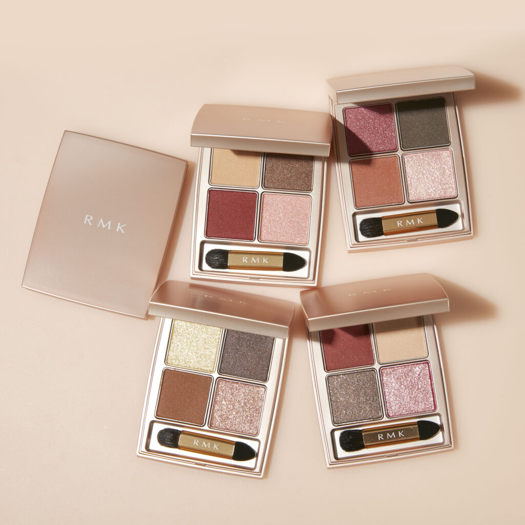 まず目を惹くのは、秋の空にインスパイアされたメインアイテムの4色アイシャドウパレット「RMK ローズウッドデイドリーム 4アイズ」