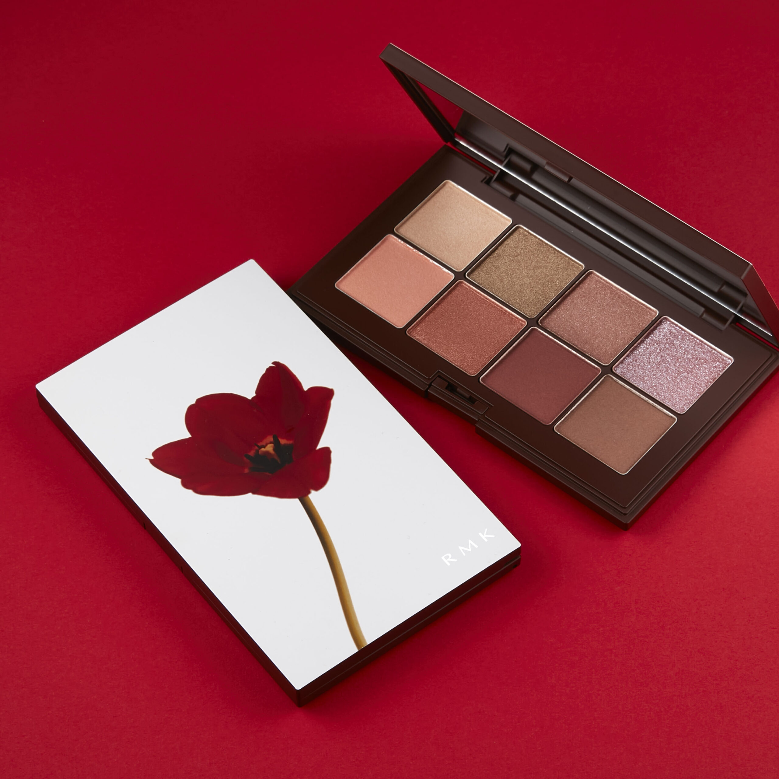 ■■今ホリデーコレクションを代表するのは、チョ・ギソク氏の代表作“赤い一輪の花”をパッケージの表面に纏い、やわらかなマット、上品につやめくシマー、華やかに煌めくシマーの3つの質感による、あたたかみのあるウォームカラーに煌めきのアクセントを添えた8色が揃う「RMK ウォーム メモリーズ アイシャドウパレット」。