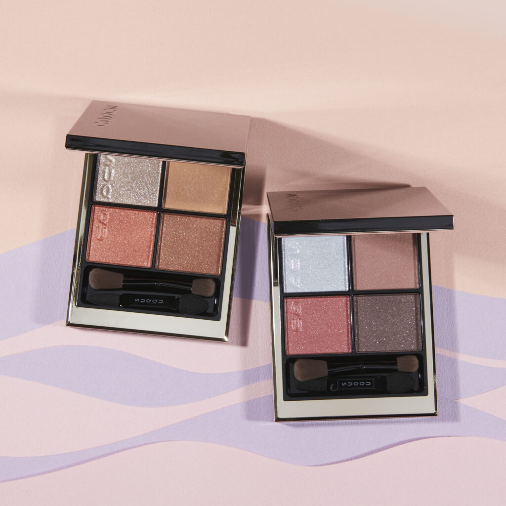 今春更なる進化を遂げ、異なる4種の質感と輝きでたちまち人気の、SUQQUを代表する新4色アイシャドウ「シグニチャー カラー アイズ」から登場するのは、夏の黄昏の海辺の煌めきを思わせる限定2種。夕暮れ時の自然な陰影を描き出す砂浜のマットカラー(パレット右上)と、華やかな煌めきを添えるメタリックでヴィヴィッドなキーカラー(パレット左下)、夕陽が射した波間の輝きを大粒パールで添えるコートカラー(パレット左上)が、愁いを秘めた大人の夏の目もとを叶えます。