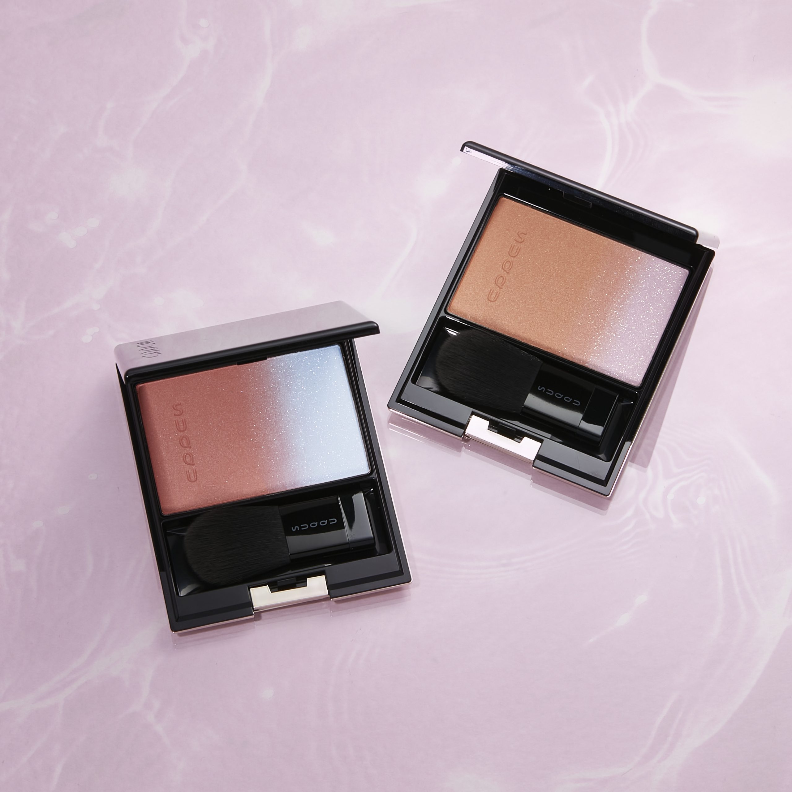 左)黄味がかったピンクのチークで優しく頬を彩り、ピンクパールを配合したペールブルーのハイライトが肌に溶け込むように自然になじむ、桜の花びらが浮かぶ水面を表現した#146 花弁浮 HANABIRAUKABE(限定色)