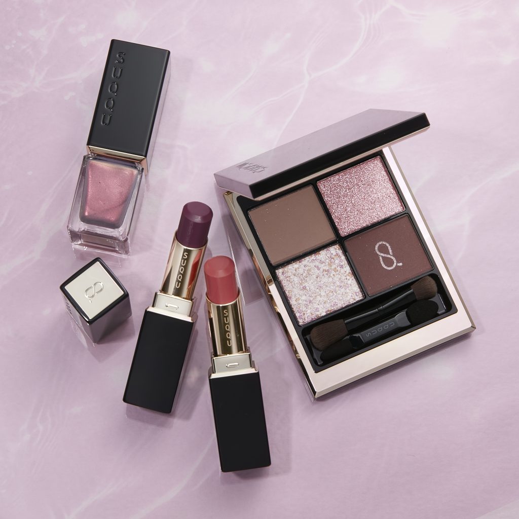 SUQQUの公式ページでは、水面に溶け込む春の色の艶めきをやわらかに纏うメインルックをはじめ、春の霞とディープカラーをテーマに、シックでモダンに洗練された印象へ仕上げたルックと、芽吹く緑が眩く揺れ、清らかな透明感あふれる印象に仕上げたルックも紹介されています。