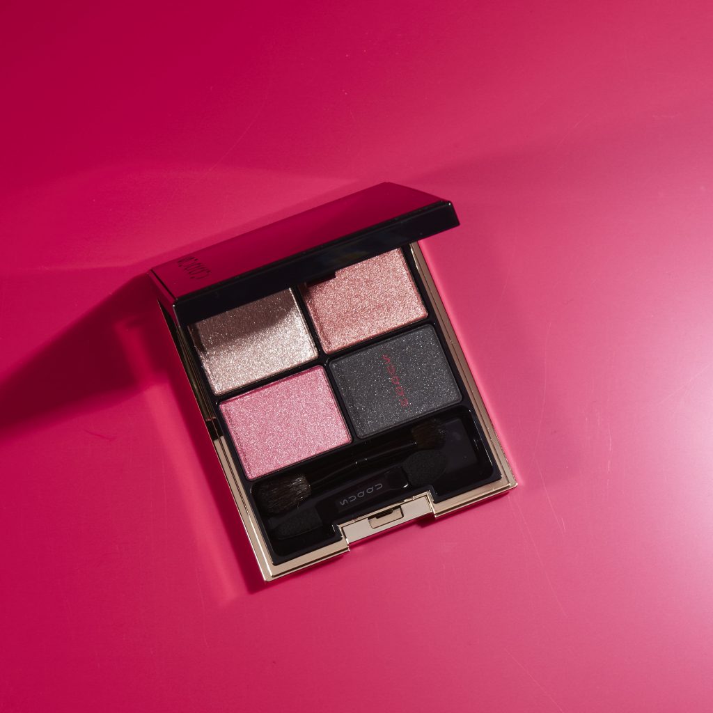 宵闇の浮かび上がる“LADYISH NEON”なネオンピンクを中心としたピンクのグラデーションは、鮮やかなインパクトを与えるアクセントカラーのホットピンク(左下)と、鋭く華やかな輝きを実現するスパークル処方の大粒パールを贅沢に配合したハイライトカラー(左上)、肌になじませ自然な奥行きを演出するニュアンスカラー(右上)。さらに、スモーキーなニュアンスブラック(右下)で引き締めることで、クールでモダンな眼差しに仕上げることができます。潔さを感じさせる切れ味のピンクが、強く意志のある大人の女性の魅惑的な目もとを完成させます。