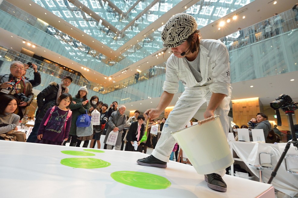 日比野氏が来場者の”笑顔のもと”をイメージし描き出すスマイルアートや巨大キャンバスにスマイルアートをライブペインティングし、たくさんの人に笑顔を広げました。