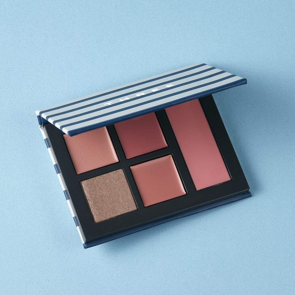持っているだけで楽しい気分になれるボーダーのパレットには、クリームとパウダーの異なる質感を楽しめる2色のアイカラーと、リップでもチークでも楽しむことのできる2色のリップ/チークカラー、リップバームのように乾燥から唇を、守り、潤いのツヤ感を楽しめるティントリップ1色の5色がセットイン。解放された表情を彩る新たなニュートラルメイクが、青い空と自由な空気へと思いを馳せさせ、春を運んできます。